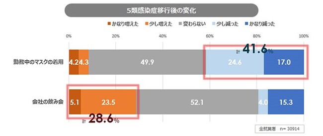 19.コロナウイルス5類感染症移行後(23年5月8日以降)、就業時のマスク着用は「減った」計(少し+かなり)が41.6%。会社の飲み会は「増えた」計(少し+かなり)が28.6%。