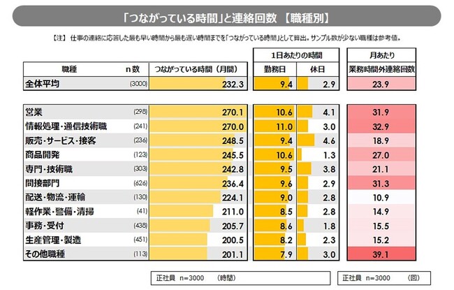 14.職種別の「つながっている時間」では、営業職が月間270.1時間で最長。勤務時間外に連絡が来る回数は、月あたり平均で23.9回。営業職は31.9回。