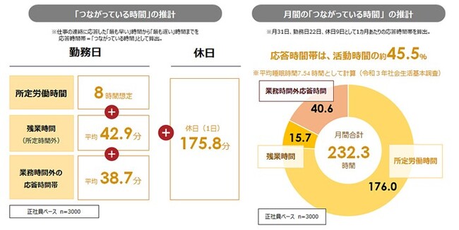 また、遠隔での勤務やスマートフォンの普及によって問題になっているのは、勤務時間外の業務連絡が多すぎるという問題だ。今回、正規雇用社員の「つながっている時間(業務連絡の応答時間帯)」を推計すると、平均で月間232時間となり、これは人の活動時間のおよそ45%程度にあたる。業務外連絡が日常化している企業は、社内でのルールや顧客への案内などの対策を検討したい。