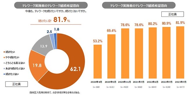 昨年から続くテレワーク実施率のダウントレンドは、新型コロナウイルスの第5類感染症への移行後、さらに顕著に見られている。6割は特に会社からの指示は無く、2割は原則出社の指示がでている。テレワーカーのテレワーク継続意向が8割を超え続けている実態と合わせて考えると、企業は自社の人材獲得力とのバランスを考慮する必要がある。なし崩し的ではなく戦略的にテレワークを位置づけ、従業員と積極的にコミュニケーションしていきたい。