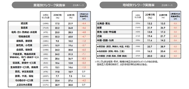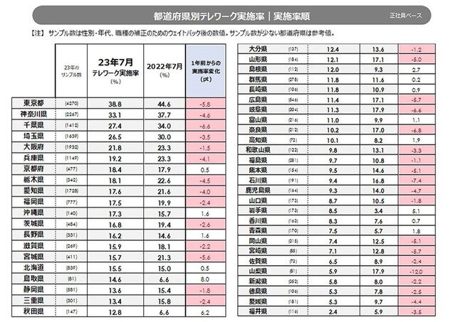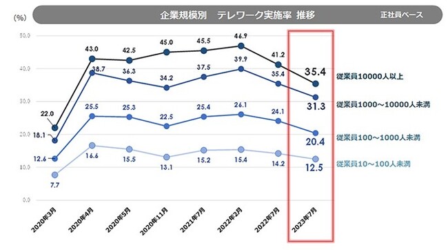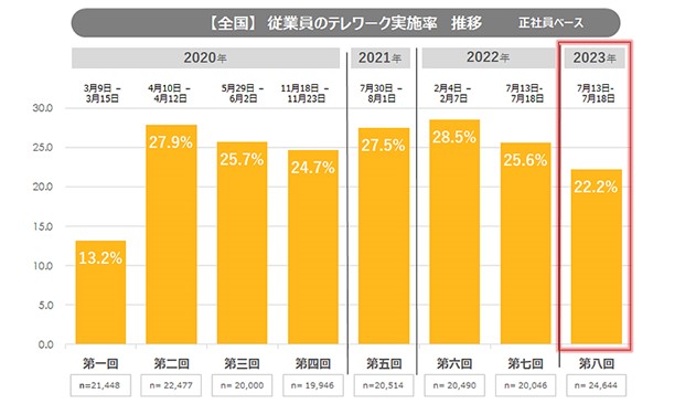 1.2023年7月のテレワーク実施率は22.2%で、2020年4月以降で最も低くなった。