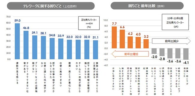 11.テレワークしているときの困りごとは「運動不足を感じる」が59.0%。「仕事に集中できない」などが前年同期よりも増加。