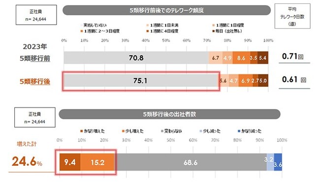 3.コロナウイルス5類感染症移行後(2023年5月8日以降)、テレワーク非実施者が増加。職場の出社者数は「増えた」が合計24.6%。