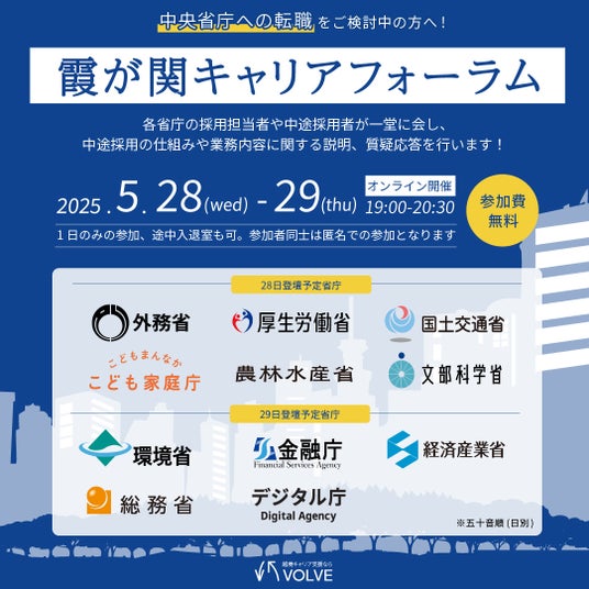 VOLVE株式会社(代表取締役CEO:吉井 弘和、本社:東京都千代田区、以下当社)は、来る5月28日および29日に、11の中央省庁を集め霞が関に特化した中途採用イベント「霞が関キャリアフォーラム」をオンライン開催いたします。