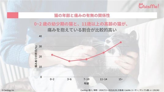 また、猫の年齢別に見ると、0~2 歳の「幼少期」と11 歳以降の「高齢期」において、猫が痛みを抱えている割合が比較的高いということがわかりました。