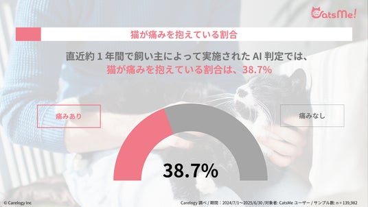 直近約 1年間のアプリ内で実施された AI 判定の結果によると、飼い猫が痛みを抱えていた割合は、38.7 %にのぼることが判明しました。