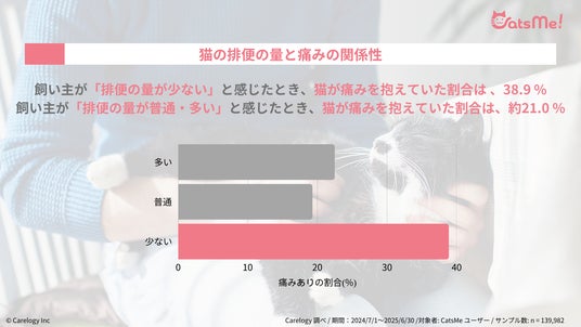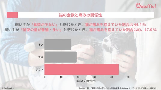 さらに、猫の食欲・排便と痛みの関係性を見ると、猫の食欲が少ないと感じる場合、猫の排便の量が少ないと感じる場合において、猫が実は痛みを抱えている割合が明確に高いことがわかりました。