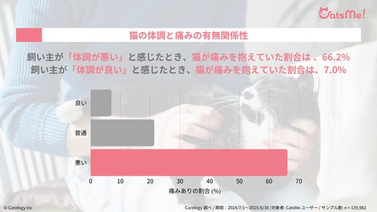 中でも、飼い主が「猫の体調が悪い」と感じたとき、猫が実際に痛みを感じていた割合は 66.2% となり、飼い主が「体調が良い・普通」と感じているときと比較して非常に高い結果となりました。