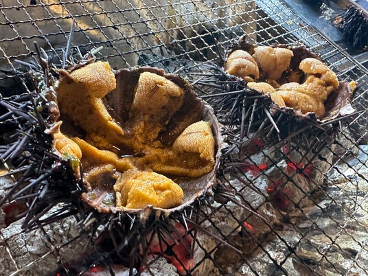 その、生でも食べられる新鮮な生ウニを、とげとげの殻ごと炭火で炙って食べる激レアで贅沢な体験!