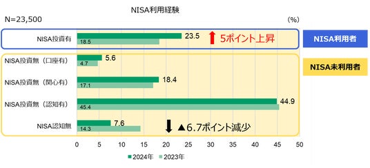 - 投資経験有りは、昨年から5ポイント上昇して23.5%、4人に1人がNISAを利用しています。