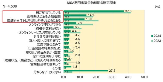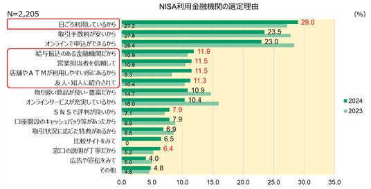 - NISA利用金融機関の選定理由のうち、昨年より比率が増加した回答に着目すると、「日ごろから利用している」「給与振込」「営業担当者を信頼」「店舗網」「友人の紹介」が上位となり、身近な金融機関が選ばれている傾向がみられます。
