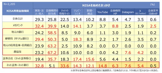 - NISAを始めたきっかけをNISA利用金融機関別にみると、ネット証券・ネット銀行では、インターネット経由が 68.2%(情報サイト、YouTube、金融機関ホームページ、Instagram、X、金融業界団体ホームページの計)に上ります。一方、地元の銀行、ゆうちょ、信金・信組、農協等では「金融機関の担当者」が特に多く過半数を占めています。
