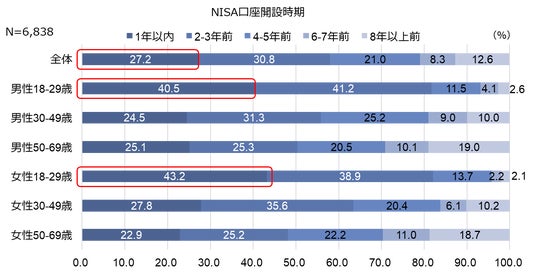 - NISA口座の開設時期は、1年以内が約3割を占めています。中でも18-29歳の若手世代の4割以上が、新NISA制度開始に向けて行動を起こしたことが分かります。