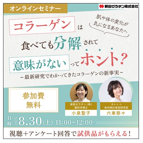 新田ゼラチン株式会社(本社:大阪府八尾市二俣2丁目22、代表取締役社長:竹宮秀典、以下新田ゼラチン)は、最新の研究からコラーゲンの新事実をお伝えする無料オンラインセミナーを開催いたします。