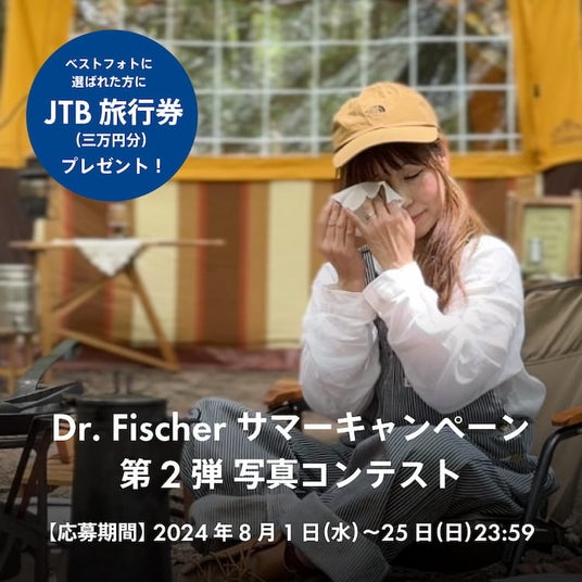 夏のレジャーにもぴったりのドクター・フィッシャーの目元ふきとりシートは、目元を簡単に洗浄してリフレッシュし、保湿できる持ち運びに便利な個包装タイプ。そこで、皆さんがドクター・フィッシャーと一緒に夏をエンジョイしているお出かけ写真の投稿をお待ちしています。ベストフォト賞1名様には、JTBの旅行券3万円分をプレゼントいたしますので、奮ってご応募ください。