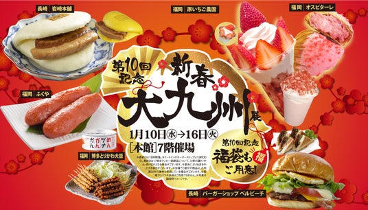 九州物産展で毎度人気を誇る商品から、旬を迎える「いちご」のスイーツが集合。また今回は10回目の開催を記念して人気の名店から“10”にちなんだ特別奉仕品や記念福袋をご用意します。