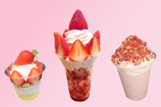(左から)博多あまおうミニパフェ(1個)756円、博多あまおうパフェ(1杯)1,200円、プレミアムあまおうスムージー(1杯)756円
