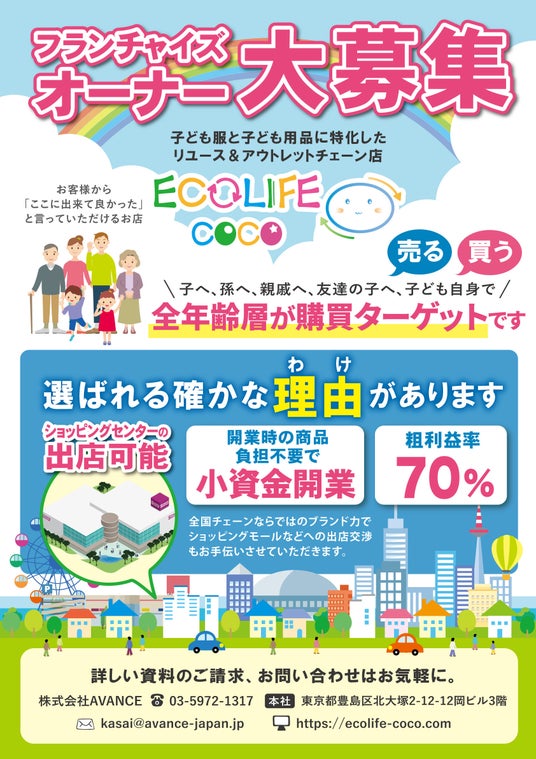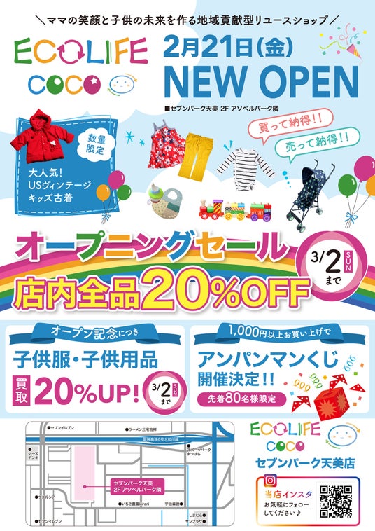 株式会社AVANCE(本社:東京都豊島区 代表取締役:葛西 佳織 )は子供服リサイクルショップECOLIFE COCO(エコライフココ)「セブンパーク天美店」を2025年2月21日(金)にオープンすることが決定いたしましたことをお知らせいたします。