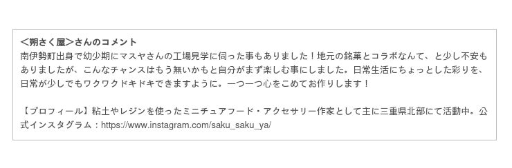 今回タッグを組んだのは、マスヤと同じく三重県で活動されているミニチュアフード・アクセサリー作家の「朔さく屋」さんです。“日常を彩るワクワクドキドキをお届けしたい”という想いを共にした出会いが今回の商品の誕生につながりました。