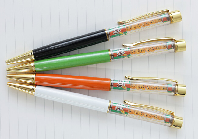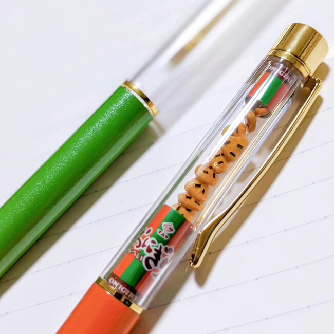 シャカシャカ振ると、まるでパッケージからおにぎりせんべいが飛び出してくる雰囲気が楽しめる、ちょっとシュール?!でも可愛さ満点のおにぎりせんべいの世界観たっぷりなボールペンが完成しました。