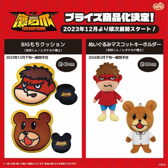 アニメや映画など幅広い世代から長年にわたって愛されいる『秘密結社 鷹の爪』 のプライズ商品がエルココから新登場!吉田くん&レオナルド博士の『ぬいぐるみマスコット』、大きさ約40cmの『BIGクッション』が全国のアミューズメント施設で2023年12月下旬より順次展開!