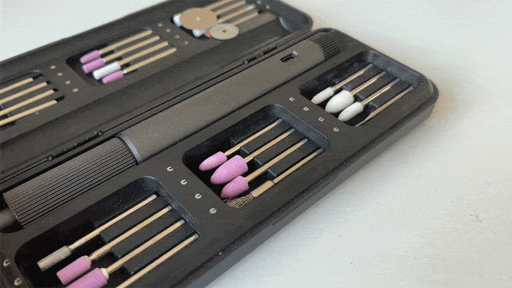 本製品はミニボディながら、木材やガラスの加工、彫刻やカット、アクセサリーの研磨など、素材に合わせた加工で様々な用途にお使いいただけます。アルミ合金製で、マットな質感とダークグレーの外観がスタイリッシュなデザインとなっています。