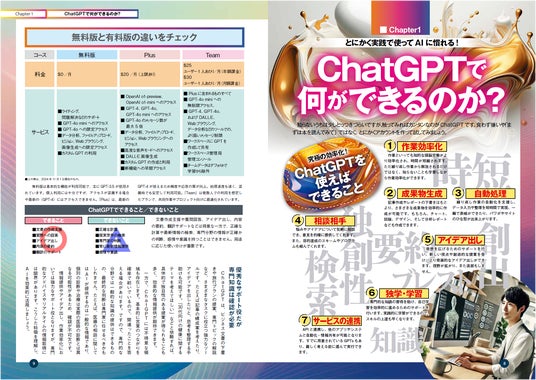 「ChatGPTで何ができるのか?」をやさしく指南。ビジネス文書の下書きから、創造的なアイデア出しなど、幅広いタスクを効率化する方法を具体的に紹介します。ChatGPTの得意分野と苦手分野を明確に示し、より効果的に使いこなすためのテクニックを網羅。さらに、無料版と有料版の違いを徹底比較し、自分に合ったプラン選びをサポートします。