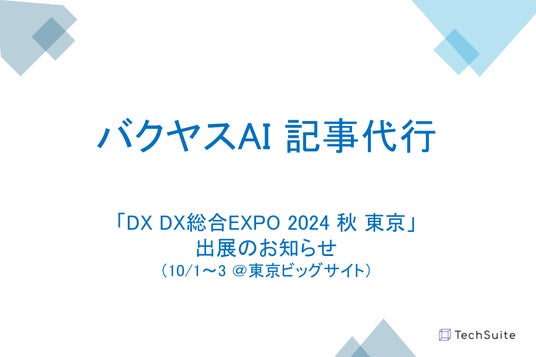 TechSuite株式会社(テックスイート/代表取締役: 畠山夏輝)は、2024年10月1日(火)から3日(木)の3日間で東京ビッグサイトで開催される「DX 総合EXPO 2024 秋 東京」に出展し、生成AIを活用した最先端のコンテンツSEOサービス「バクヤスAI 記事代行」をご紹介いたします。