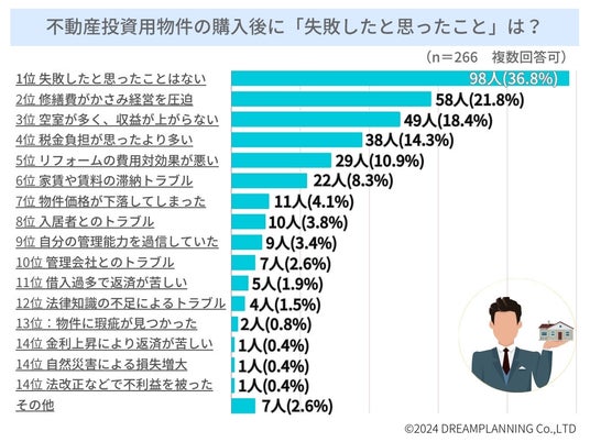 不動産投資家266人に不動産投資の失敗例を調査したところ、最も多かった回答は「失敗したことはない」というものでした。