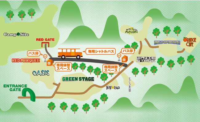 場内でも距離のある2つのステージを結ぶ専用シャトルバス、トイレ完備の専用休憩スペースの利用と、対象の飲食店での優先購入がセットになったパス。これで、移動・休憩と、フェスごはんの購入がスムーズに!