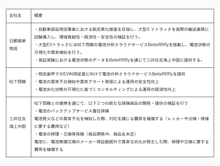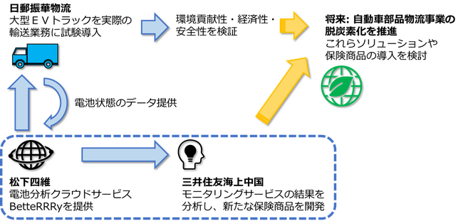 3社は2023年7月から24年1月にかけて実証実験を行います。日郵振華物流は、大型EVトラックを試験導入し、天津市内の工場間で自動車部品輸送を実施します。その際、松下四維の電池分析クラウドサービスBetteRRRy(ベタリー)を利用し、大型EVトラックの環境貢献性・経済性・安全性の検証を行うと同時に、電池状態のデータをBetteRRRyを通じて三井住友海上中国に提供します。