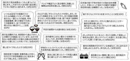 具体的な発言内容をみると、男性は「仕事」、女性は「家事」など、日々の忙しさから解放された瞬間、子ども連れの旅行の場合は、「子供にとっての初めて」を一緒に体験することに「非日常」を感じるという回答が多くあがりました。普段から身の回りにも存在する夜景やカフェ、街並み、電車の駅なども、旅行先では一味違う趣があるようです。また、ここのところの訪日外国人旅行者の増加を反映して、海外の旅行者との関わりから「非日常」を感じるといった声も聞かれました。