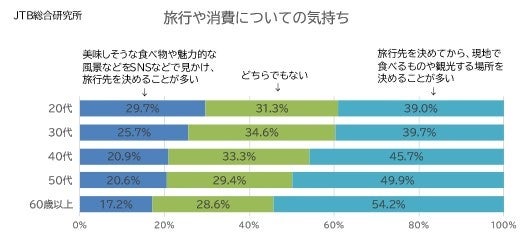 SNSを中心とした、文字情報から画像や動画情報へのシフトは、旅行先の選び方にも影響を与えているようです。今回の調査結果から、若い世代になるほど、「美味しそうな食べ物や魅力的な風景などをSNSなどで見かけ、旅行先を決めることが多い」という回答率が高くなりました。