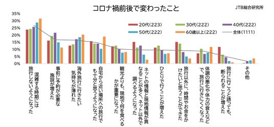 一方、20代では、「ネットの情報と現地情報が異なることが多く、ネット以外で調べるようになった」、「旅行以外に、時間やお金をかけたいと思うことができた」、「旅行に行こうと誘っても断られることが増えた」の回答率が高い傾向がみられました。