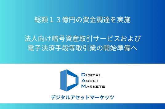 株式会社デジタルアセットマーケッツ(本社:東京都千代田区、代表取締役:西本一也、以下「当社」)は、複数の国内企業を引受先とする総額13億円の資金調達を実施したことをお知らせいたします。本資金調達により、今後の金融規制動向を踏まえた自己資本の充実を図るとともに、法人向け暗号資産取引サービスおよび電子決済手段等取引業の開始に向けたシステム開発・体制整備等に充当し、事業化に向けた準備を加速します。
