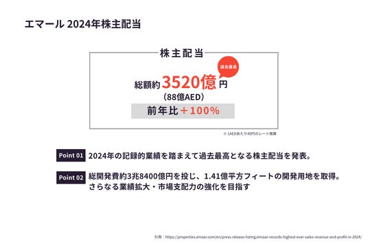 ※ 2024年のドバイ不動産デベロッパー別シェア(出典:Property Monitor)において、EMAARがシェア1位を獲得。