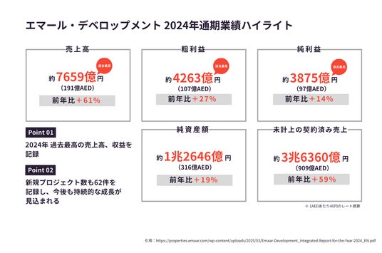 エマールグループ傘下でUAE国内の開発販売を担うエマール・デベロップメント(Emaar Development PJSC)も、2024年に史上最高の業績を記録しました。主な実績は以下の通りです。