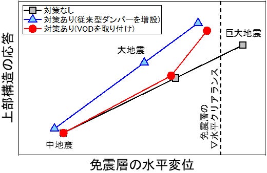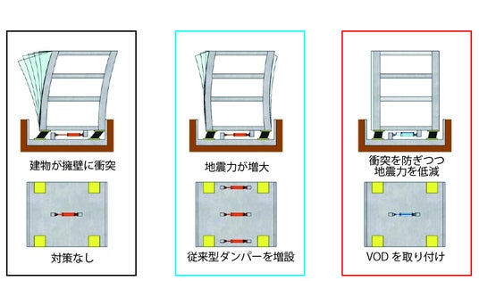 従来型ダンパーを増設して減衰性能(地震のエネルギーを吸収し揺れを小さくする性能)を高めるなどの方法がありますが、この場合、免震性能が低下し、上部構造に作用する地震力が大きくなってしまいます。そこで、免震性能を損ねることなく、免震層に過大な変位が生じることを防ぐVODを開発しました(図-1)。