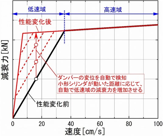 地震による揺れが続いている間は、性能変化により増加した減衰力を維持することで建物の水平変位を抑制し、地震が収まった後は増加した減衰力が自動で元の状態に戻ります。