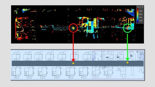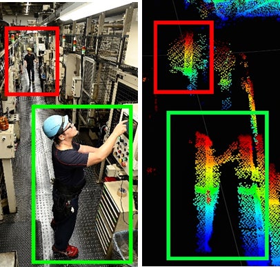製造ラインを上から見た点群データ(上)、データを分類し、マップ上に人の位置・動きを表示(下)