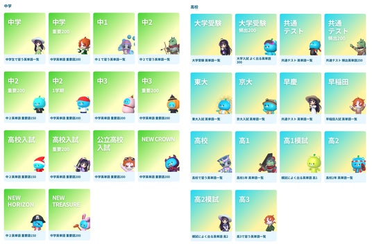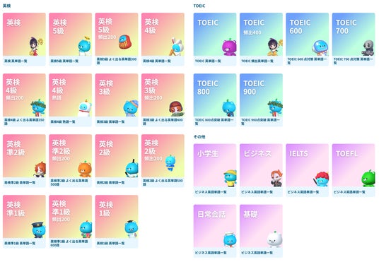 本サービスでは、英検・TOEIC・大学受験・高校受験・IELTS・TOEFL・小学英語・英会話まで対応した全52冊・のべ63,713語の単語帳を完全無料で提供します。例えば「TOEIC800レベル単語」「英検1級英単語」「東大頻出英単語」など、それぞれの分野に特化した英単語帳を全52冊公開しました。