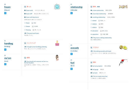 各単語帳では、英単語が重要度順に並べられ、それぞれの単語の意味・例文・画像・発音記号・音声・イメージ画像・関連語・フレーズ・類義語との違い・英英まで完備されています。様々な側面から英単語を学ぶことで、本当に「使える」記憶になるまで習熟することができます。