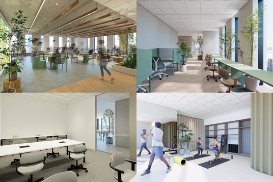 左上から:ラウンジ(GARDEN)、フリー席(集中エリア)、完全個室(9人区画)、軽運動スペース(ATHLETIC)