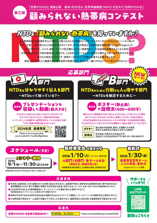 世界14億人以上に影響を与えている顧みられない熱帯病(Neglected Tropical Diseases: NTDs)※1の認知度拡大・政策提言活動を行っている一般社団法人NTDs Youthの会(事務所:福岡市博多区、代表理事:轟木亮太)は、「第三回 顧みられない熱帯病コンテスト(後援:外務省、厚生労働省)」における受賞者表彰式が行われたことをご報告いたします。本コンテストは、世界NTDの日2026・日本実行委員会主催のもと、一般社団法人NTDs Youthの会がコンテスト/ウェビナーの企画・運営を担当し、開催されました。