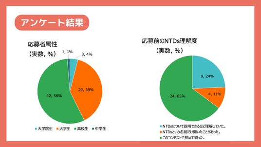 応募総数はA部門で16チーム(35名)、B部門で21チーム(40名)でした。応募者の中では高校生が過半数、次いで大学生が全体の4割を占めました。また、応募者の約6割がこのコンテストで初めてNTDsを知った生徒・学生でした。これらの応募者の中から、世界NTDの日・日本実行委員会による一次審査を通過した各部門6チームが最終審査会へ進みました。