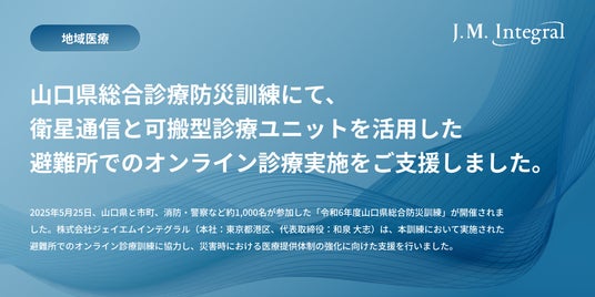 2025年5月25日、山口県と市町、消防・警察など約1,000名が参加した「令和6年度山口県総合防災訓練」が開催されました。株式会社ジェイエムインテグラル(本社:東京都港区、代表取締役:和泉 大志)は、本訓練において実施された避難所でのオンライン診療訓練に協力し、災害時における医療提供体制の強化に向けた支援を行いました。
