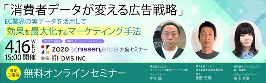 株式会社ディーエムエス(本社:東京都千代田区、代表取締役社長:山本 克彦、以下当社)は、株式会社ZOZO(本社:千葉県千葉市、代表取締役社長兼CEO:澤田 宏太郎、以下ZOZO)と株式会社ニッセン(本社:京都府京都市、代表取締役社長:羽渕 淳、以下ニッセン)と共催で、「【DMS×ZOZO×ニッセン|共催セミナー】消費者データが変える広告戦略!“EC業界の実データ”を活用して、効果を最大化するマーケティング手法」と題したセミナーを開催いたします。
