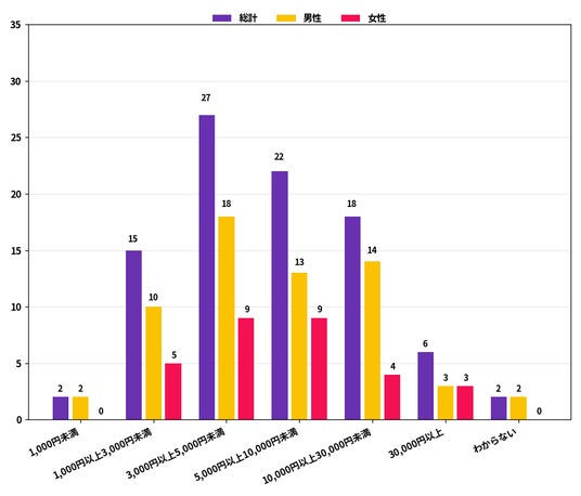 全体として、1回あたりの使用額は中間帯に集中しています。最も多いのは「3,000円以上5,000円未満」で92人中27人(29.35%)となっており、次いで「5,000円以上10,000円未満」が22人(23.91%)です。また、「10,000円以上30,000円未満」も18人(19.57%)と一定数見られ、「1,000円以上3,000円未満」は15人(16.30%)でした。一方で「30,000円以上」は6人(6.52%)にとどまり、「1,000円未満」は2人(2.17%)と少数です。「わからない」も2人(2.17%)で、全体としては3,000~9,999円程度を使う層が中心であることが分かります。