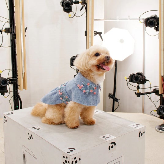 ペット専門の3Dスキャンスタジオ。複数台の高性能一眼レフカメラを配置した独自の「マルチフォトグラメトリ」技術により、1/1000秒で全方位から同時撮影。動きの多いペットでも、一瞬を切り取り高精度な3Dデータ化を実現します。