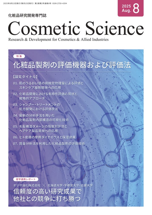 最新の研究成果をより早く、より分かりやすく!第一線で活躍する研究者を執筆陣に迎え、8月号を発刊(8月15日)。今回の特集は「化粧品製剤の評価機器および評価法」です。